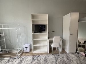 В комнате есть вся необходимая мебель: кровать, раскладной диван, стол, шкаф-пенал, открытый шкаф с полками, вешалка для одежды, этажерка для кухонной зоны, сушилка для белья.